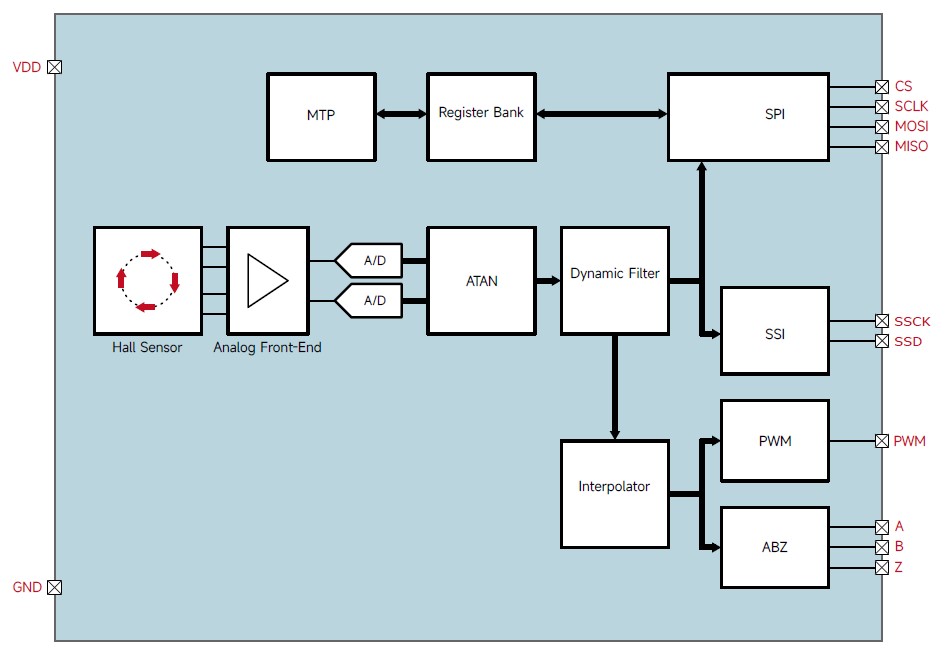 4-Draht-SPI-Schnittstelle: Diese ermöglicht effiziente Winkelablesungen und eine direkte Kommunikation mit Mikrocontrollern.