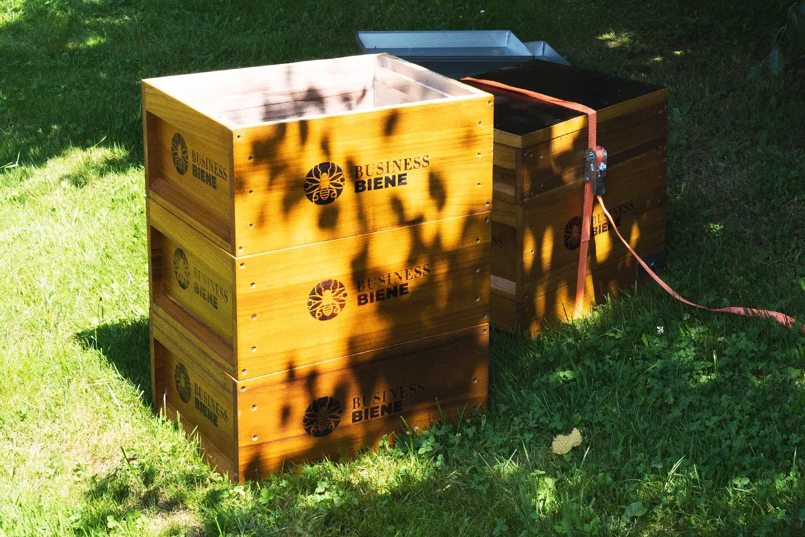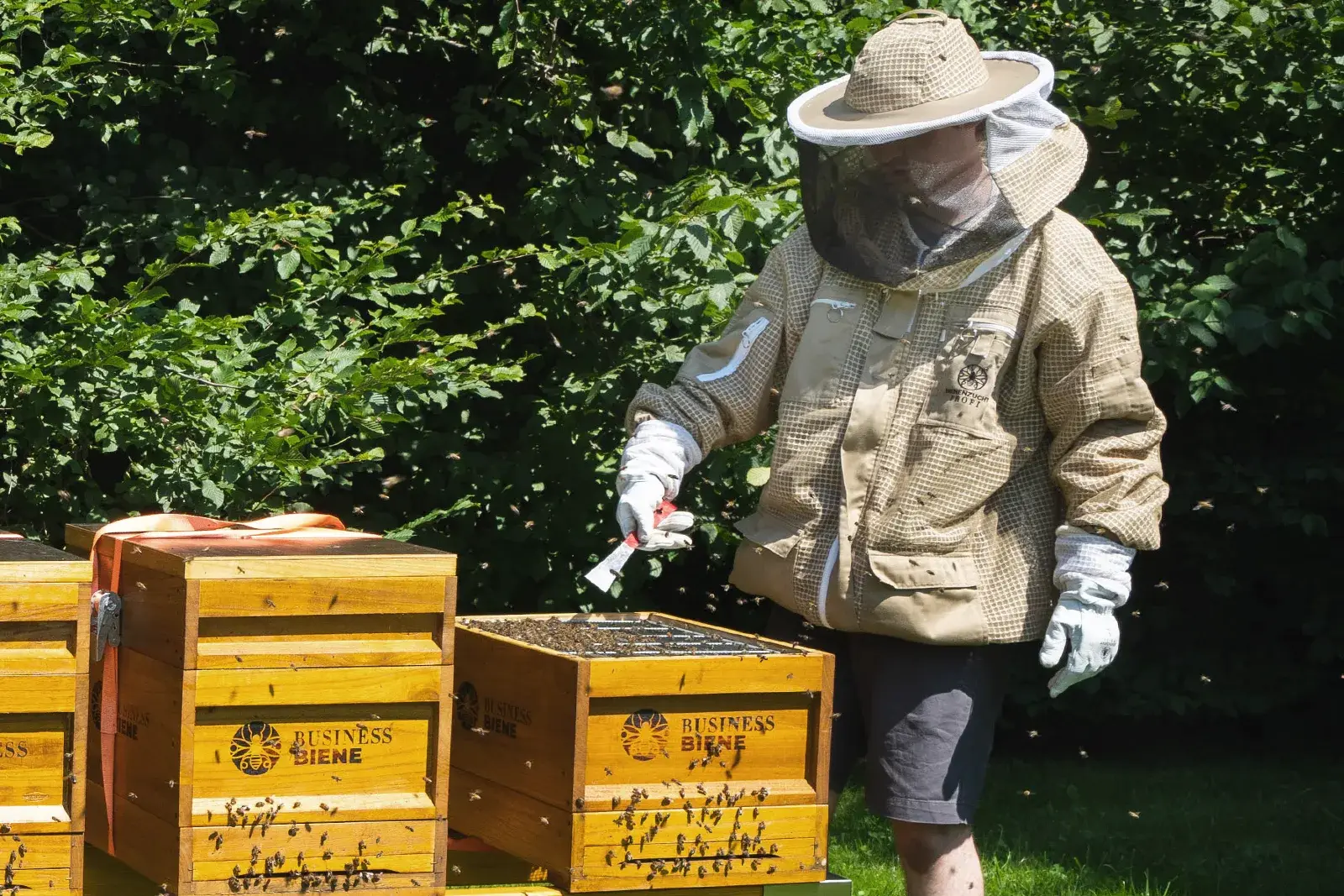 Zusammen mit der BUSINESS BIENE haben wir den optimalen „Arbeitsplatz“ auf unserem Gelände identifiziert und die fünf neuen Unterkünfte bei bestem Sonnenschein aufgestellt. Dabei hat uns Victor Dutenhöfner die Basics im Umgang mit den Bienen erläutert. Zwar übernimmt er die professionelle Pflege der Insekten, aber wir wollen nicht nur Bienenpaten sein, sondern aktiven Artenschutz betreiben und selbst Verantwortung übernehmen.