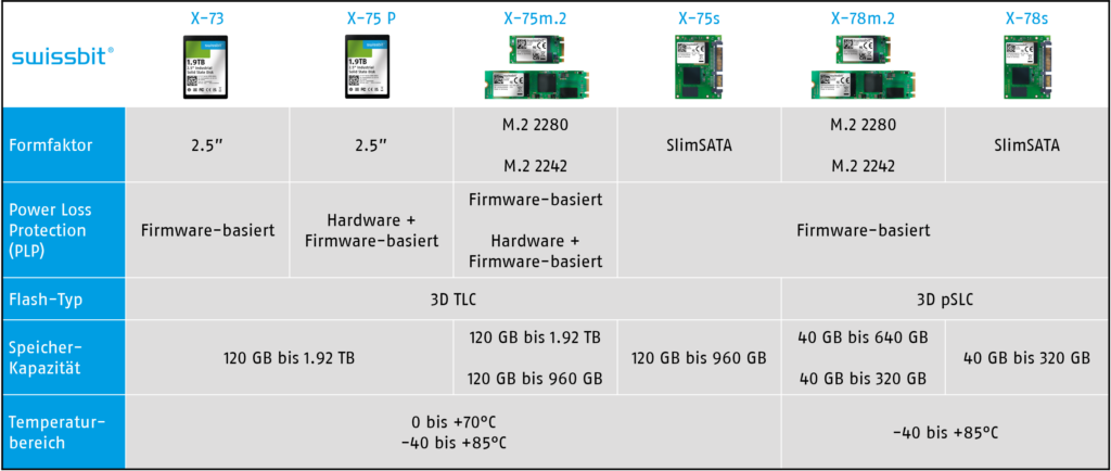Die neuen Serien X-73, X-75 und X-78 setzen auf 112-Layer 3D-NAND-Technologie und überzeugen durch ihre beispiellose Zuverlässigkeit und verlängerte Lebensdauer. Die Produktreihe umfasst die Formfaktoren M.2 2242, M.2 2280, Slim SATA (MO-297) sowie 2,5″ und bietet ein breites Spektrum mit Speicherkapazitäten von 40 GB bis zu 1,92 TB. Für eine besonders hohe Endurance beinhaltet die Serie auch Varianten im pSLC-Modus (X-78). Sie erfüllen mit herausragenden 100.000 P/E-Zyklen die steigende Nachfrage nach langlebigen und zuverlässigen Datenspeicherlösungen.