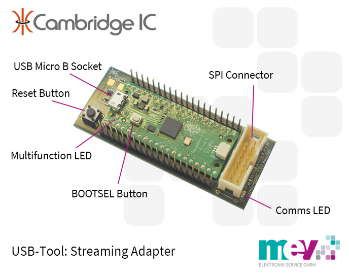 Cambridge IC has now introduced the new Streaming Adapter for communication via USB. Unlike the previous CTU-Adapter, this records the measurements via SPI with the maximum possible data rate. It efficiently makes the measurement results available via USB. These can then be evaluated, for example, with the help of PC software. In order to achieve the required high sampling rates, the Streaming Adapter is based on a Raspberry Pi with dual core. This acts as a host system for the CTU ICs (CAM204, CAM312, CAM502) connected via SPI. It is also possible to program the CTU ICs with new firmware using the Streaming Adapter. The Streaming Adapter software is written as sample code and is available upon request.