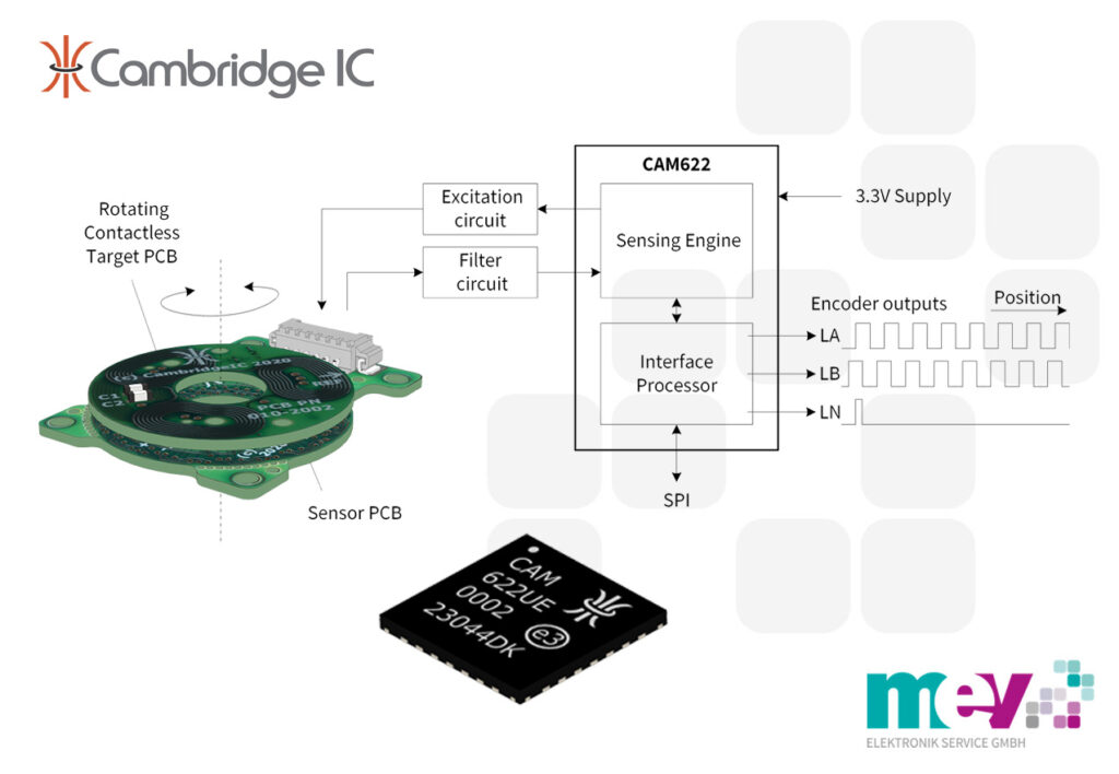 Basierend auf der bestehenden induktiven Resonator-Positionserkennungstechnologie hat Cambridge IC einen neuen Sensorprozessor mit einem skalierbaren hochauflösenden Quadratur-Encoder-Ausgang (ABN/ABZ) entwickelt. Sowohl der Sensor als auch der Positionsgeber bestehen aus leicht verfügbarem Leiterplattenmaterial (z. B. FR4) mit gedruckten Spulen. Die Sensorplatine verfügt über elektrische Verbindungen zur CAM622-Schaltung. Der Positionsgeber ist passiv und berührungslos. Hier müssen nur zwei kleine Kondensatoren angebracht werden, um einen induktiven Resonator aufzubauen. Dieses Design ermöglicht einen äußerst kompakten Aufbau.