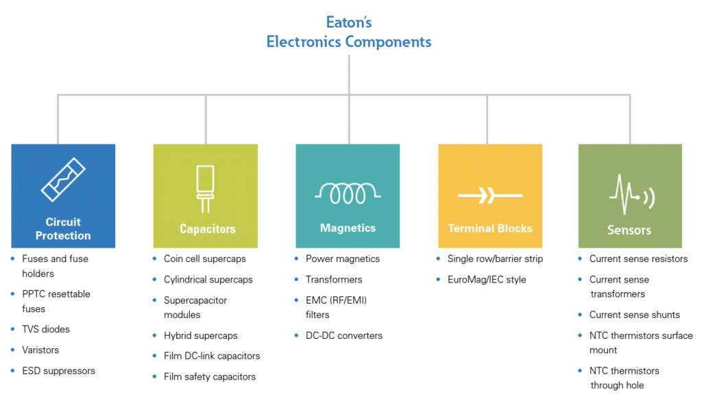 Eaton bietet eine Reihe elektronischer Komponenten an, darunter Stromversorgungs- und EMV-Lösungen, Schaltkreisschutz, Superkondensatoren, Sensoren und Klemmenblockprodukte. Diese Komponenten bedienen Kunden in den Bereichen Computer, Verbraucher, Energie, Industrie, Medizin und Transport.